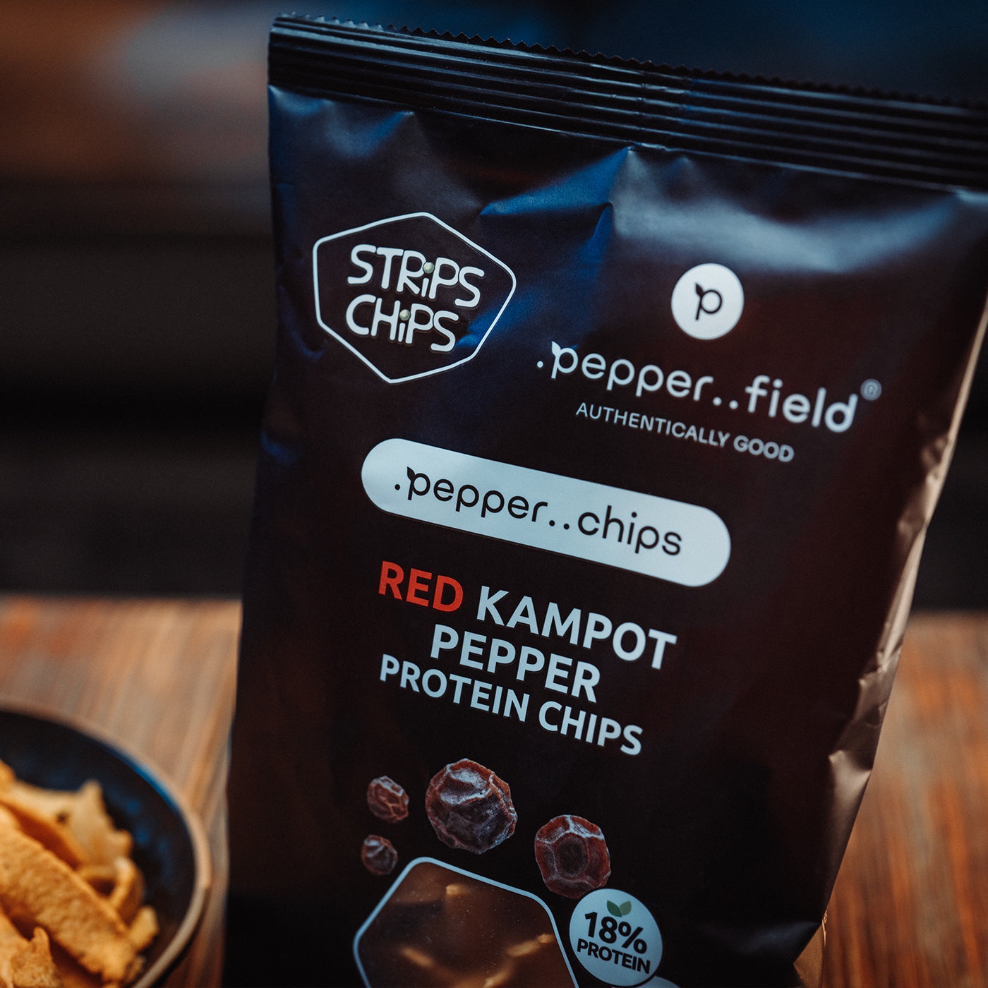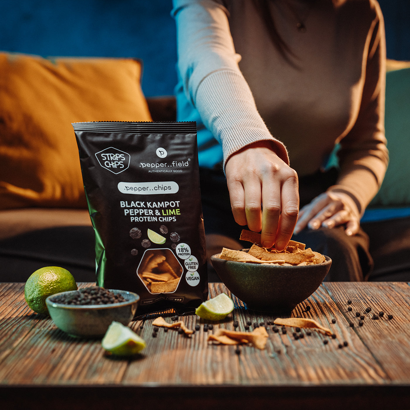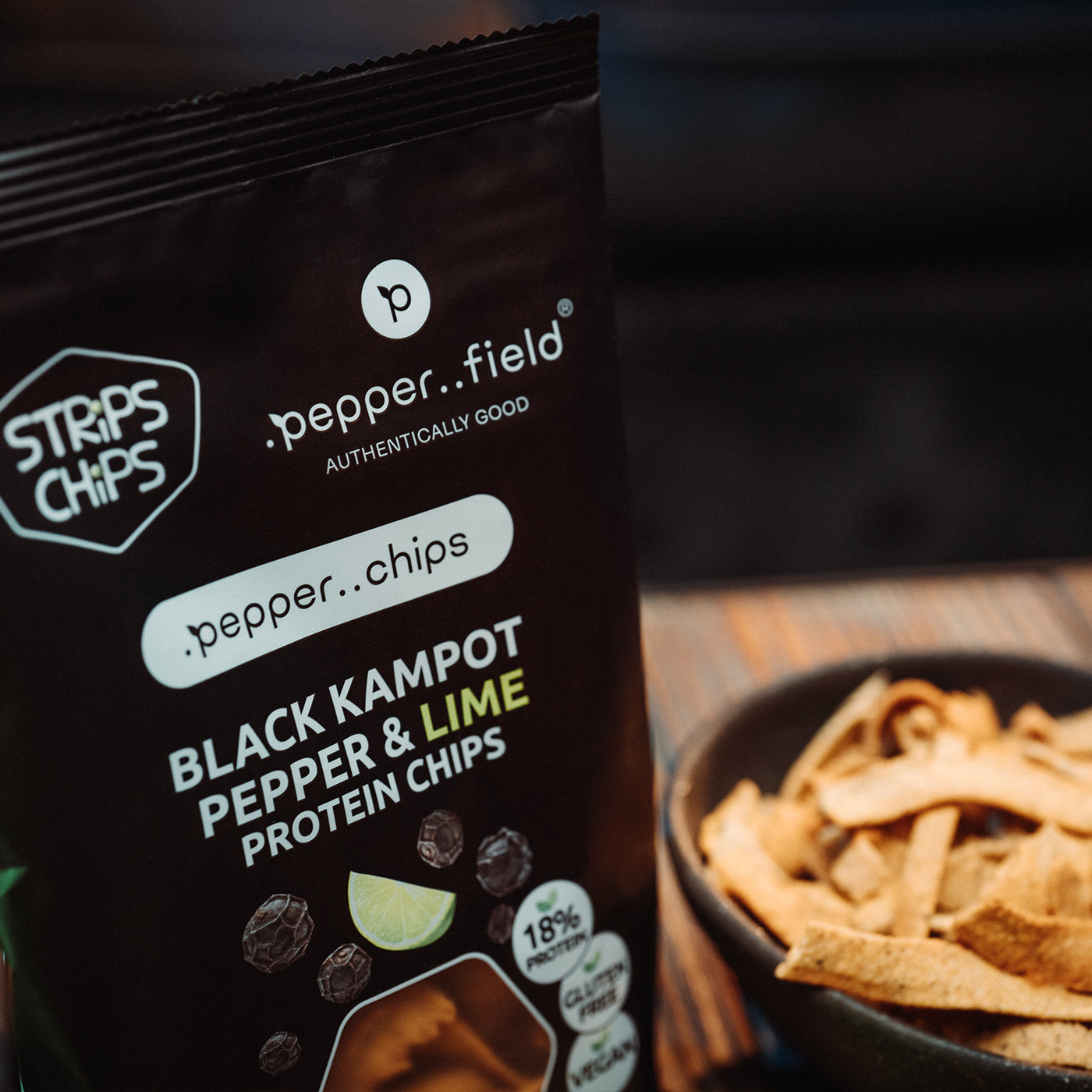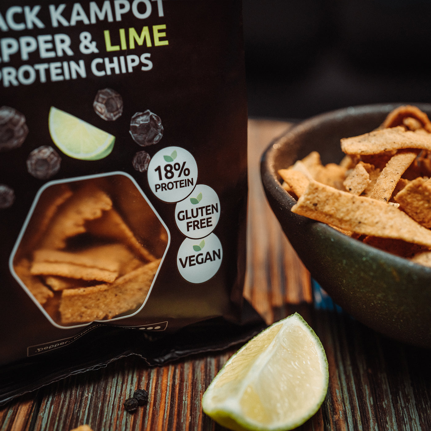 Protein chips with black Kampot pepper and lime