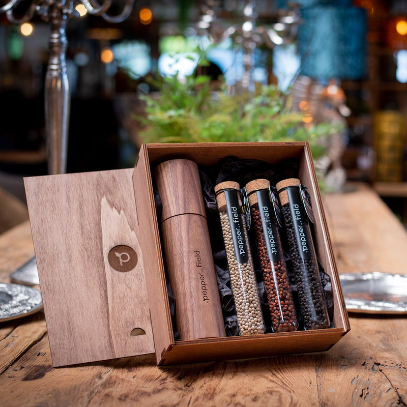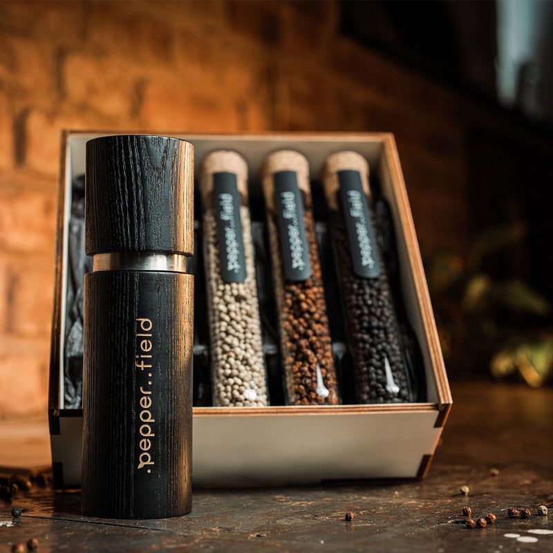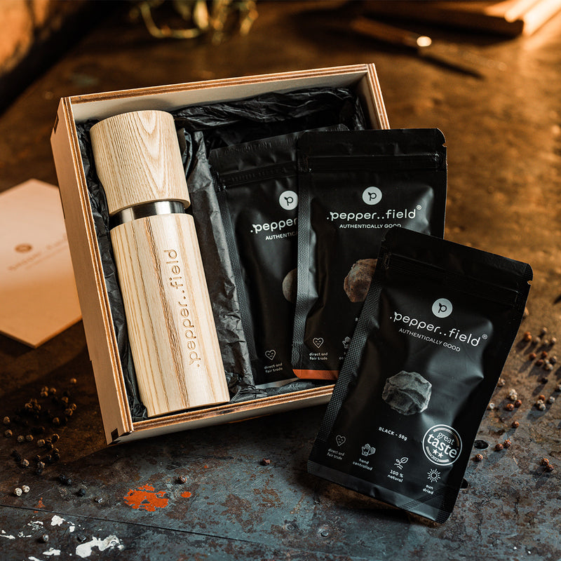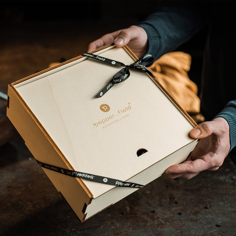 Ces cadeaux emblématiques set ont été à l’origine de notre histoire. Mais une nouvelle ère de design arrive - et nous voulons leur donner de l’espace. Tous les set contiennent notre poivre de Kampot fraîchement récolté, soigneusement emballé et assemblé cette année. Seule la veste en bois ne sera plus produite.