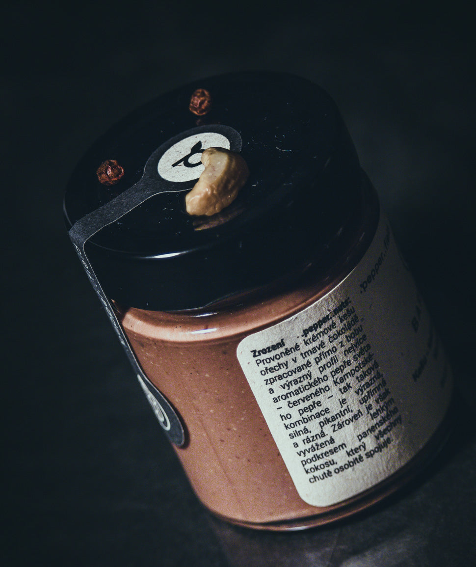 Nous avons associé la saveur délicatement terreuse des noix de cajou crémeuses avec le velouté du chocolat noir fabriqué à partir de fèves de cacao biologiques et l'avons complété par la saveur de poivre rouge et noix de coco.