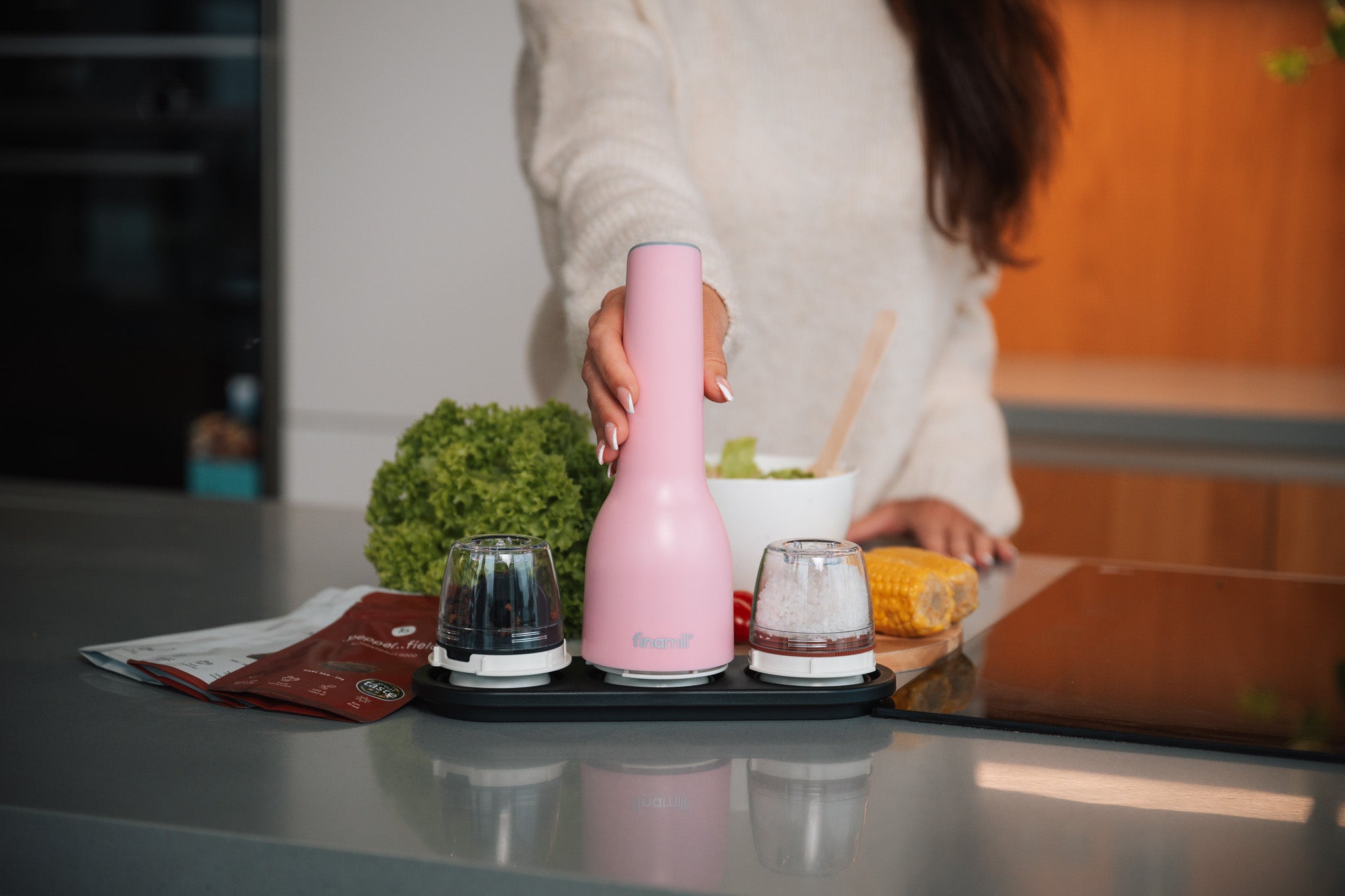 „Les épices fraîchement moulues ont tout simplement meilleur goût. Les épices moulues à l'avance dans des boîtes perdent leur saveur avec le temps car les huiles naturelles s'évaporent. Le broyage manuel est cependant exigeant et long. FinaMill apporte une nouvelle conception du moulin à épices – un broyage électrique non seulement du poivre, mais aussi du sésame, de l'ail, de l'oignon et de nombreuses autres épices grâce à des réservoirs interchangeables. Pour moudre, il suffit d'appuyer sur un bouton. Et changer le réservoir au milieu de la cuisson pour une autre épice est tout aussi facile."