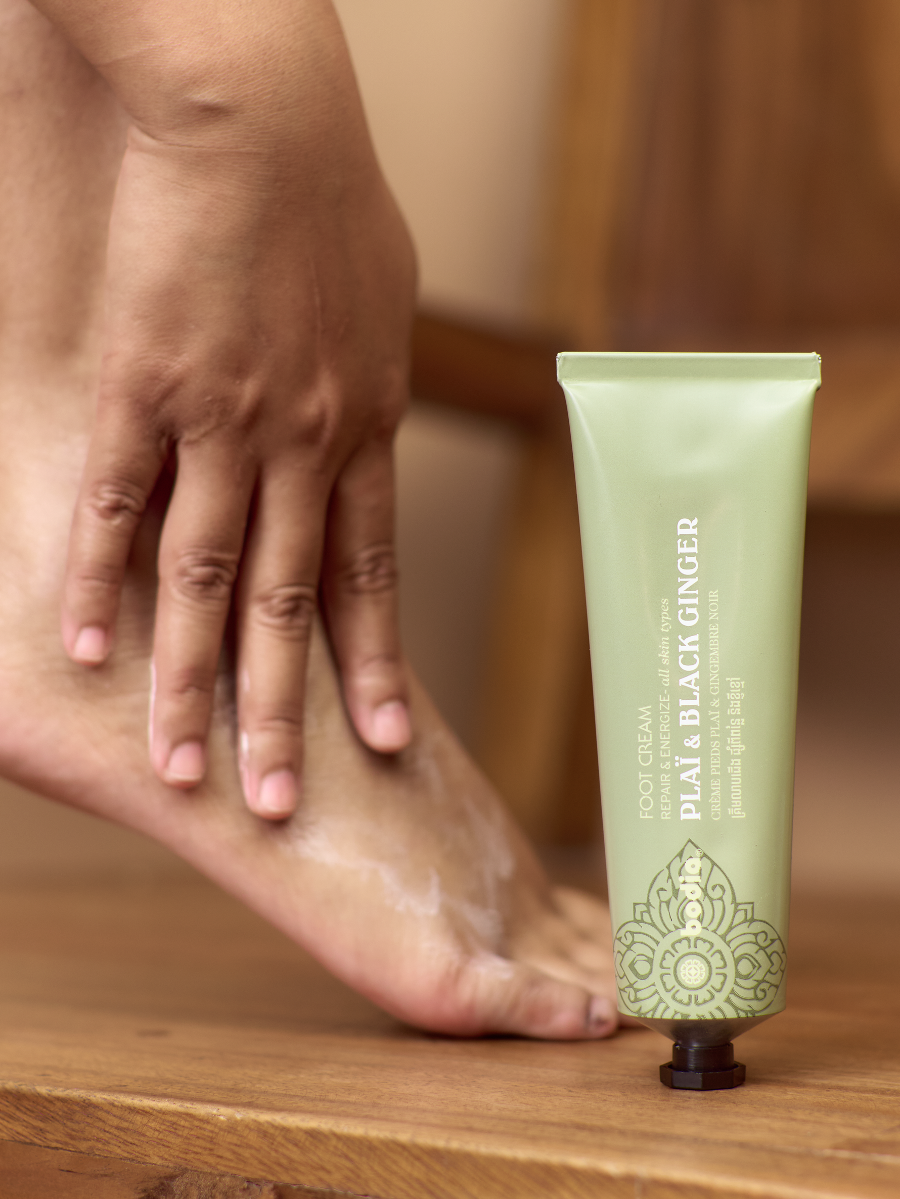 • Refreshing and softening foot cream • Light, well-absorbing cream designed for comprehensive care of the skin of the feet, soles, and dry, rough areas on the heels • Highly nourishing plant oils perfectly nourish and instantly soften the skin of the soles, while energizing extracts from black ginger and plai ginger provide quick refreshment and relief for the feet • For all skin types, ideal for dry foot skin, for care of dry, rough areas on the soles and calluses • 100 ml