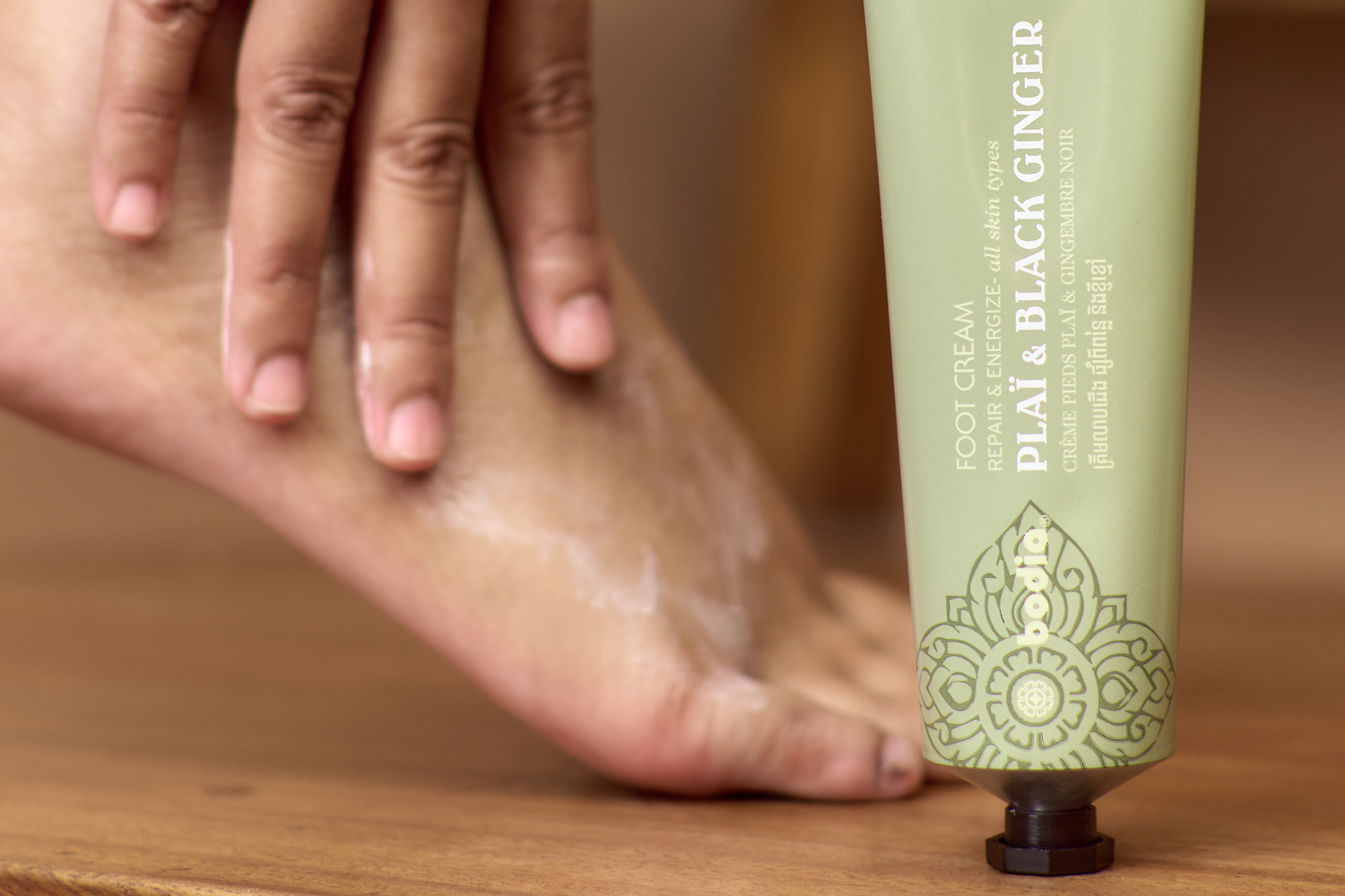 Black ginger extract: together with gentle foot massage contributes to better blood circulation in the feet and overall refreshment of the feet after exertion. Plai extract: for refreshing and revitalizing the feet Shea butter: for deep regeneration, nourishment, hydration, and perfectly silky smooth skin. Contributes to better protection of the skin against negative environmental influences. Rice oil: for nourishment, hydration, and perfect skin softness. Exceptionally effective anti-aging effect. Glycerin: for effective and long-lasting hydration.