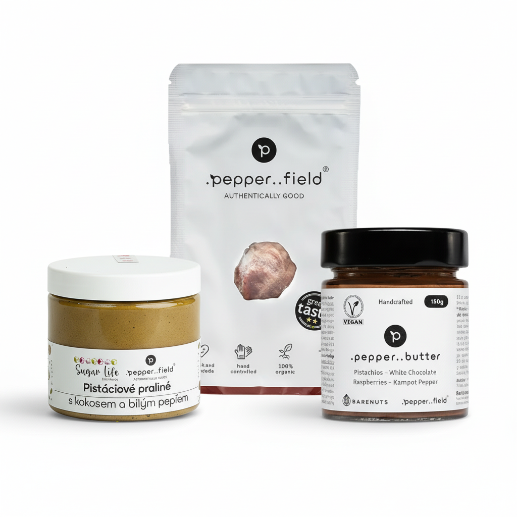 ·   The package contains delicious pistachio pralines, a new item in our assortment, and pistachio butter with white chocolate, raspberries, and white Kampot pepper