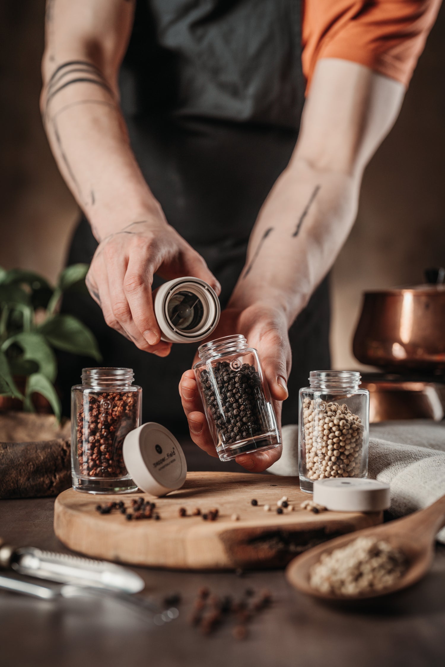 Mlynček na korenie CrushGrind s 2 sklenenými zásobníkmi a 3x50 g korenia